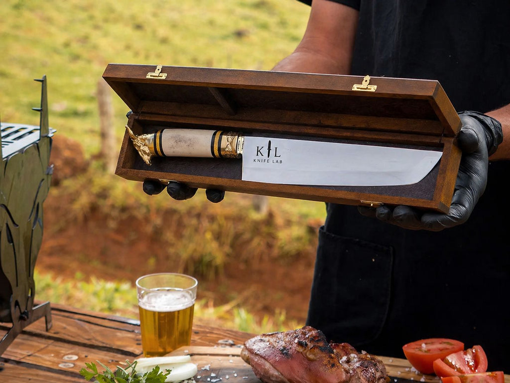A Golden Skull é uma faca de churrasco robusta, com lâmina de 9” larga e afiada, que impõe respeito no churrasco.